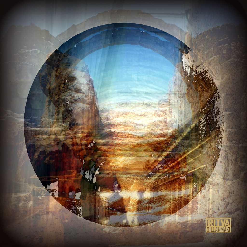 3. Kolme salaperäistä kaunista Mandalaa, joissa kikissa erilainen tunnelma. Iltaruskon portista avautuu ihana maisema ja tie. Se houkuttaa kulkemaan, mutta toisienkin porttien taakse haluaa kurkistaa.