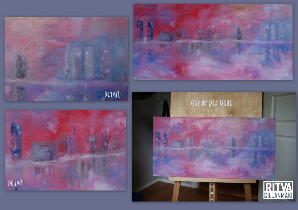 City of red light – Oil painting on canvas 80 x40 cm Ritva Sillanmäki PhotographyNovember 24, 2012Paintings of Nature Post navigation PreviousNext City of red light – Oil painting on canvas 80 x 40 cm Detail of the painting Photomontage of the painting Share this: Click to share on Facebook (Opens in new window) Facebook Click to share on X (Opens in new window) X Click to share on Pinterest (Opens in new window) Pinterest Click to email a link to a friend (Opens in new window) Email Click to share on LinkedIn (Opens in new window) LinkedIn Like Loading... Related