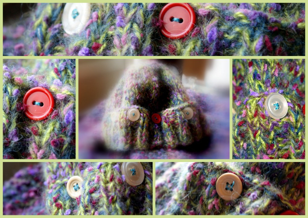 1. Napit löytyivät! Pipo on hauska, sihen sopivat vaikka mitkä napit, mutta punainen on tosi pirteä. Kollaasista tuli uusi nappilaatikko.