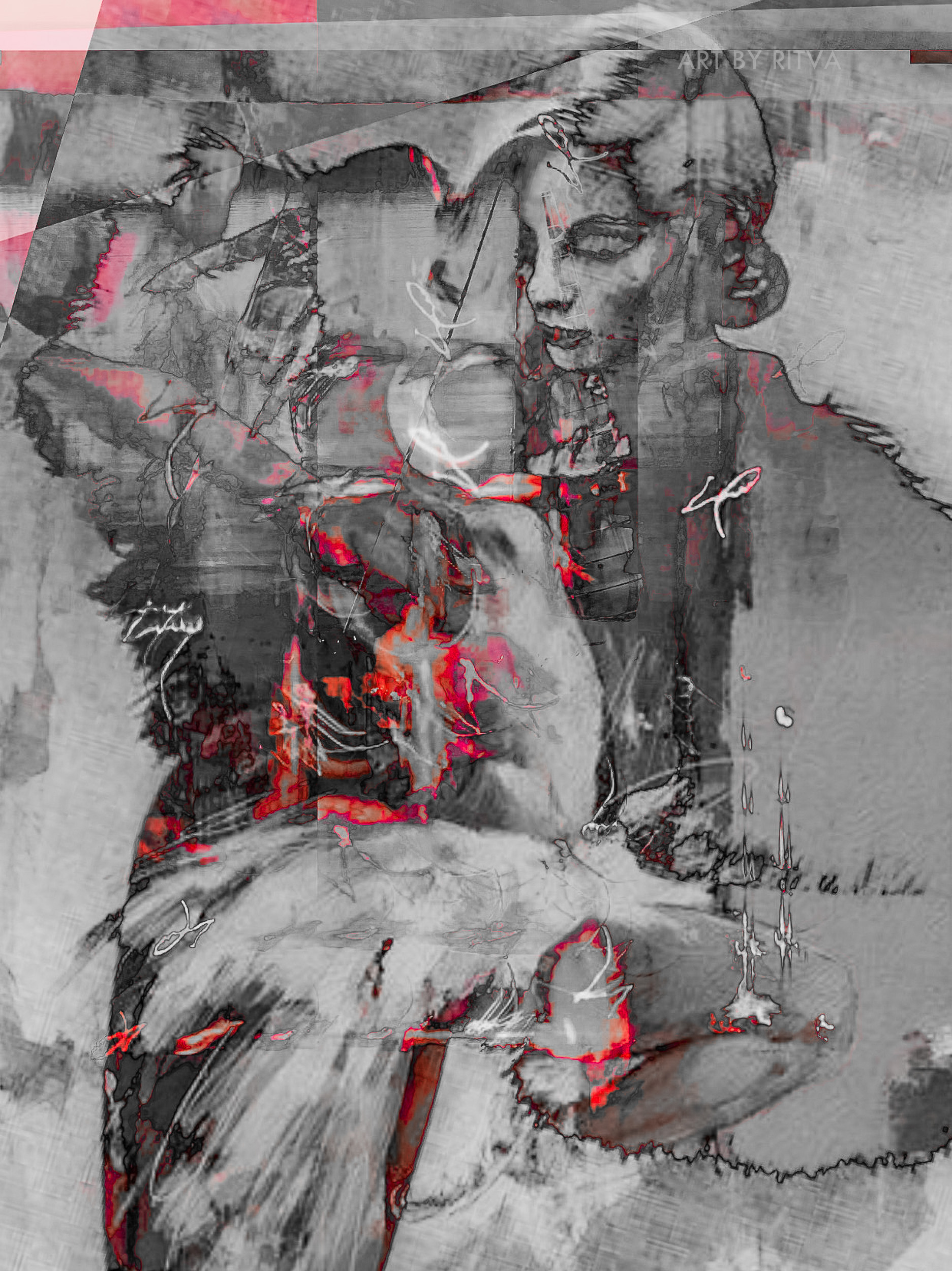 Mixed media, red and gray, movement, dreams, dance, whatever you wish to see…