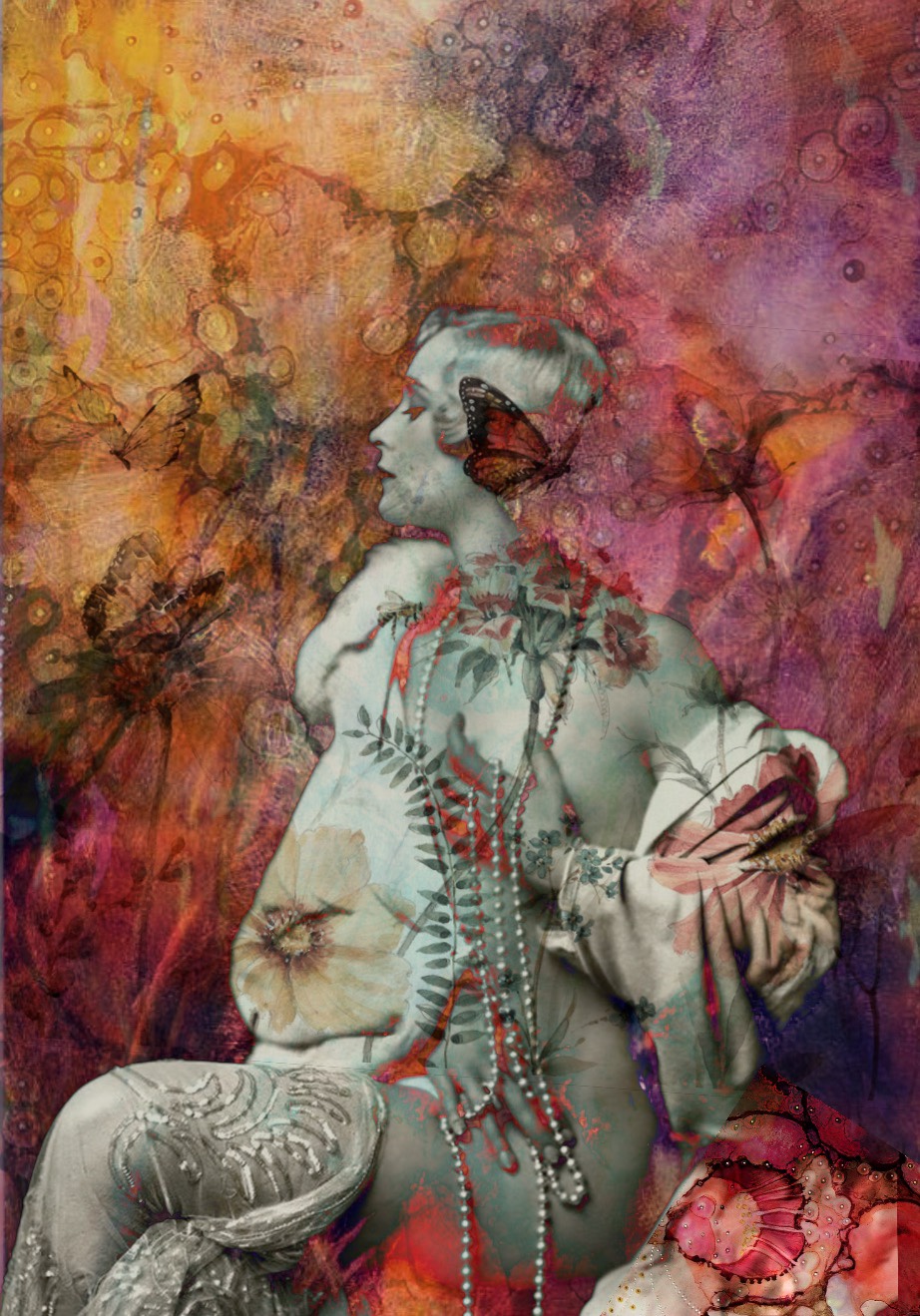 I made these two versions of this, same, but different. The colors or lack of it makes the statement. These mixed media works include old photographs, layers of flowers and texture and the power of colors. Hope you enjoy them.