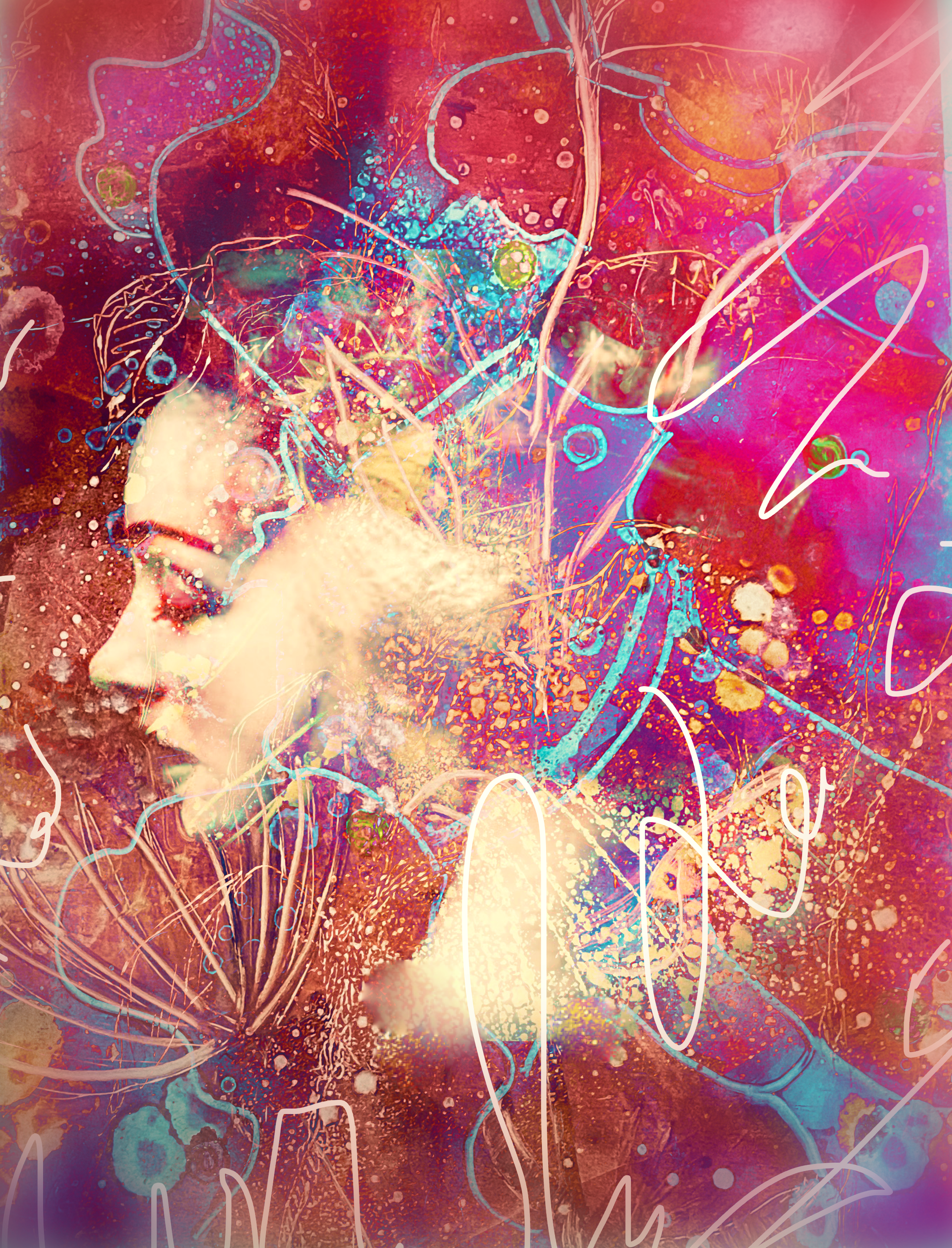 Mixed media art with turmoil as theme, I was thinking of fire, water, floating and frame of mind how thoughts get mixed in your head, how the time layers work into your dreams. Now and then mixed together. Child in us appears. Theme same color scheme totally different, but mood in the bottom one is more floating calm, slowly going down.