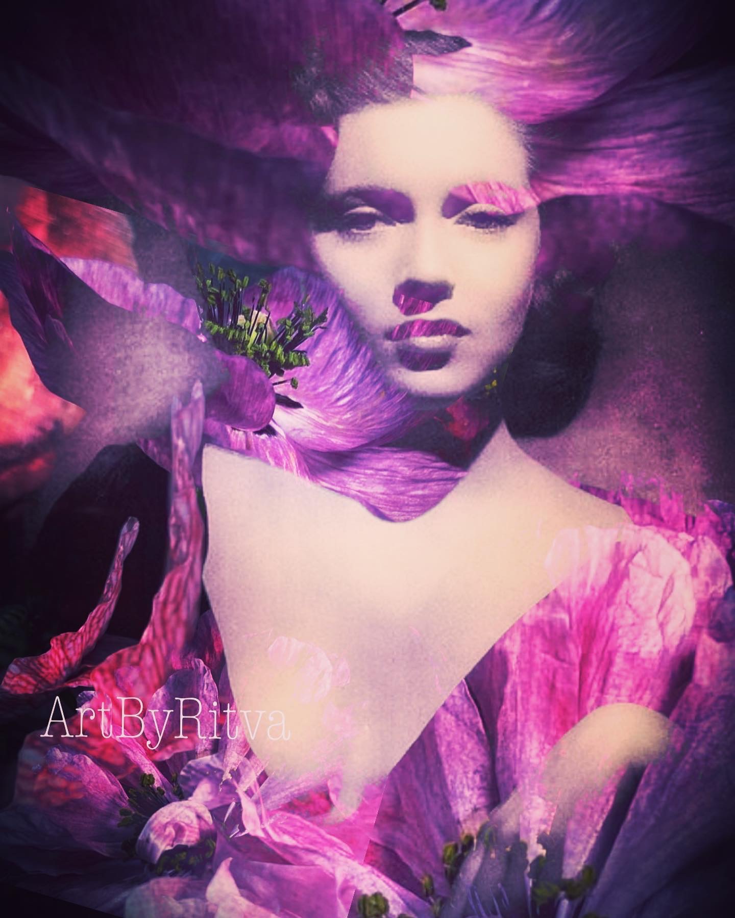 I did this with an old photo and purple flower , strong colors, this mixed media artwork is more on the romantic side of emotions. With less texture more contrast . I also did the same artwork with added colors and light spots and for some reason I find the first version more appealing to me.