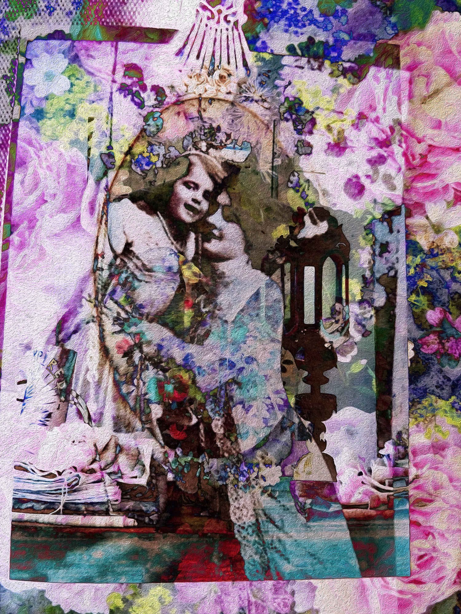 It combines photos of nature and people with structural layers made using old photographs, my paintings, and sculptures.