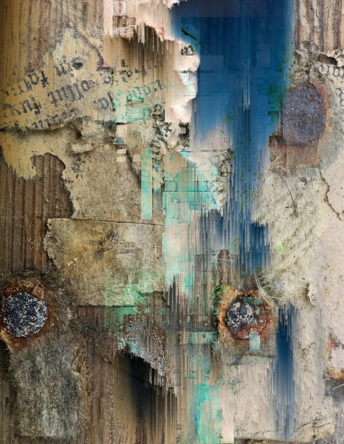 I really like the combination of worlds here, the written words, the peeling walls and stone , and the blue glitch.