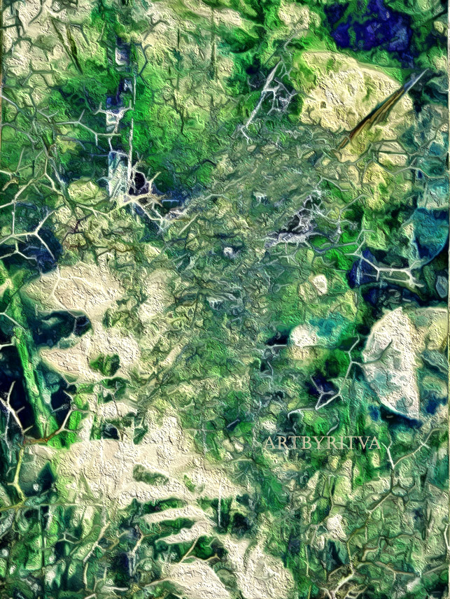 Green Abstract is a mixed media artwork presenting an abstract painting. The predominant color scheme consists of various shades of green, complemented by subtle touches of blue and white. The piece showcases a textured surface, blending organic and geometric shapes. Its composition is characterized by a chaos, with layered elements that add depth and intrigue.