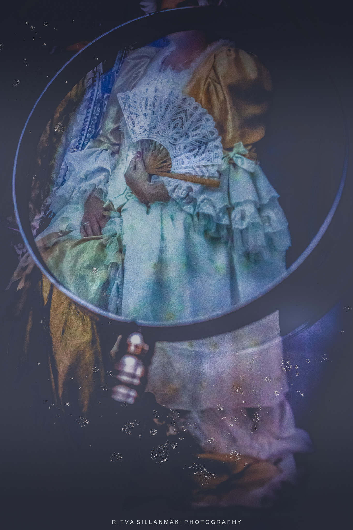 My artwork portrays a woman in vintage clothing holding an ornate fan. The magnifying glass held by someone’s hand is focusing on the person’s torso, making the details of the clothing and fan more prominent. The background is dark and indistinct, drawing attention to the central focus created by the magnifying glass. The ethereal quality of the image due to its color grading adds to the overall mood of the artwork moody tone,