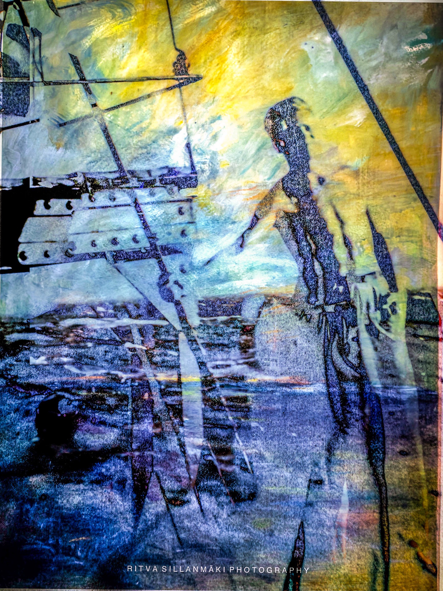 My dad was at sea from very early age, the story in the family is from thirteen on, but for sure a from sixteen, as I found a sea passport. In these images I combined my father’s old photos and my own monotype graphic art