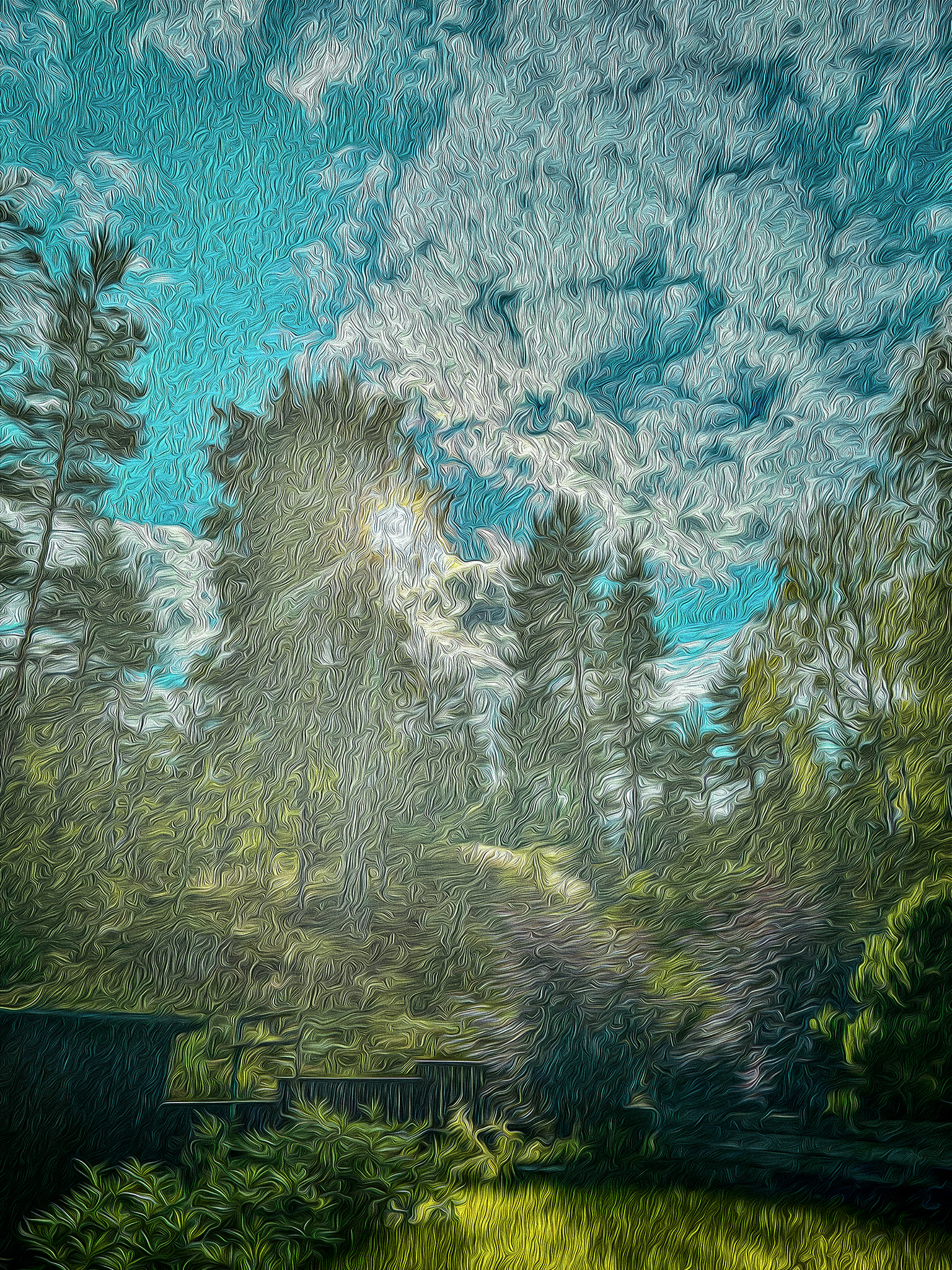 I haven’t done any digital art lately, so I am totally rusty in that way, but I had to try something to reignite my creativity. I decided to create a piece inspired by a photo I took of my backyard. In the late afternoon, the sun filters gently through the trees, casting playful shadows on the ground. The clouds drift lazily, forming nice shapes against the vibrant blue sky, creating a picturesque scene. It’s a reminder of the beauty of nature during this transitional season, and you can truly feel the subtle touch of autumn in the air as the leaves begin to dance with the breeze, hinting at the changes to come.