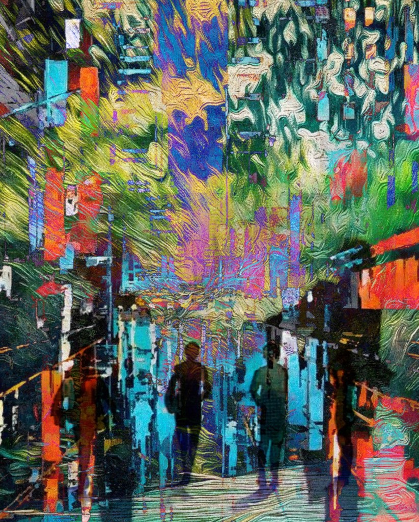 A vibrant photomontage showcasing colorful figures entering the unknown and abstract patterns, merging nature with artistic layers, aiming to captivate your imagination. The interplay of hues and shapes draws attention to the intricate details, while the natural elements seamlessly coexist with the artistic designs, illustrating a harmonious balance between the organic and the constructed.