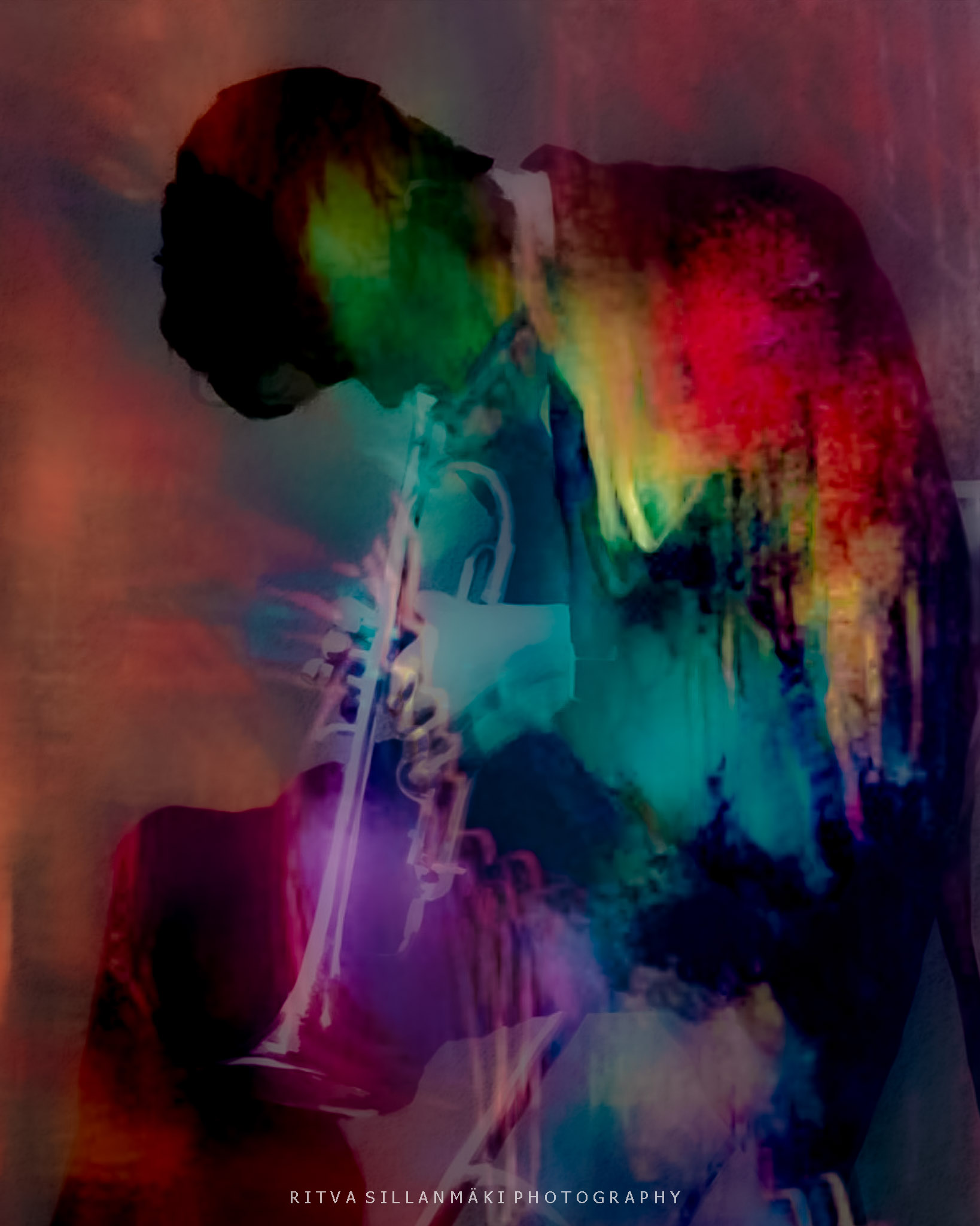 A vibrant and abstract representation of a musician playing a trumpet in a colorful coat showcasing an artistic blend of colors.