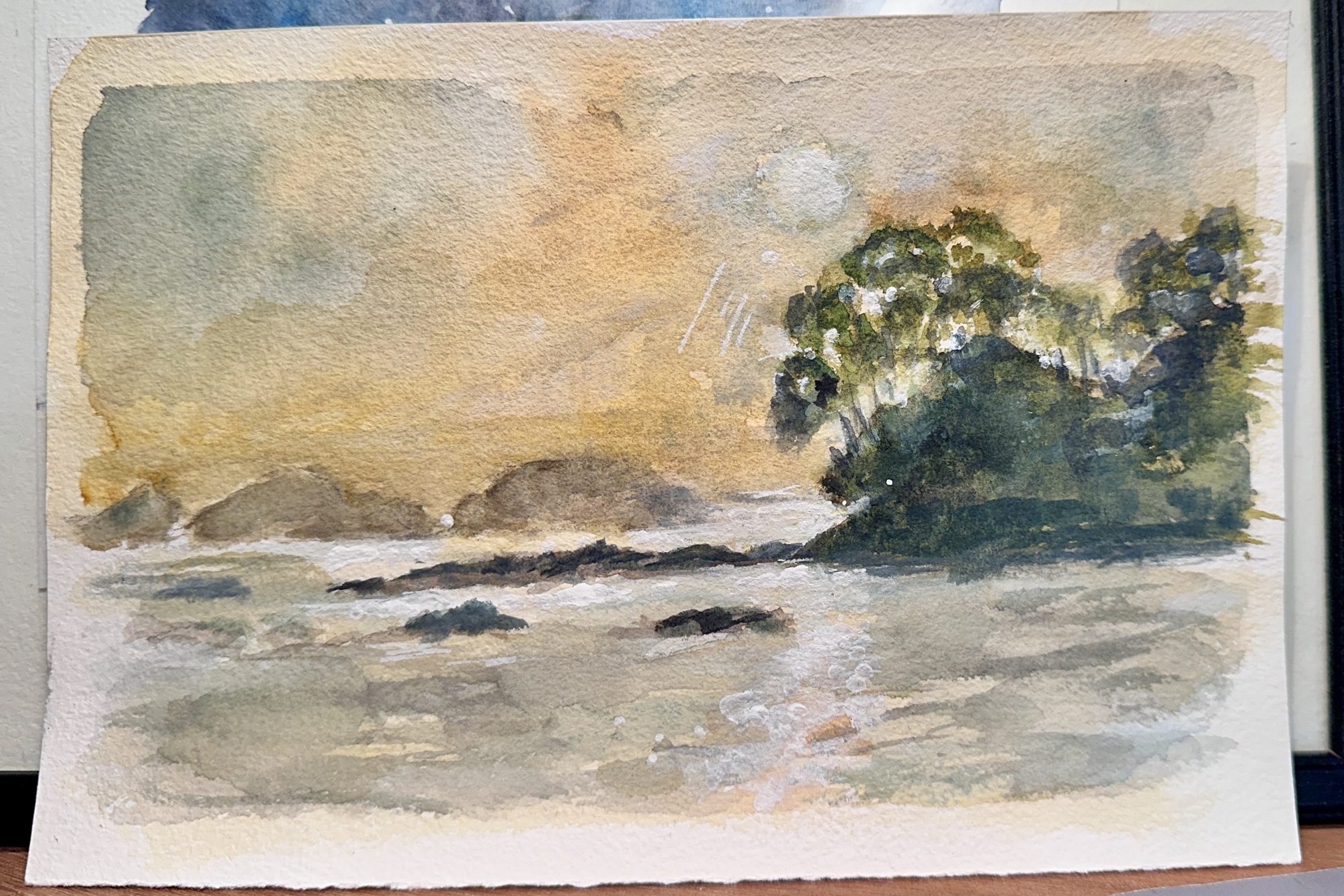 Early morning at Casey’s Beach, the delicate morning mist hovered lazily above the water, creating an ethereal atmosphere that gently cradled the shoreline. As the sun began to rise, its golden rays pierced through the mist, casting a warm glow on the sand and illuminating the scene with a soft, enchanting light that inspired this aquarelle painting. The rhythmic sound of the gentle waves lapping against the beach, combined with the tranquil beauty of nature awakening, made the moment feel magical and timeless, capturing the essence of a perfect coastal dawn.