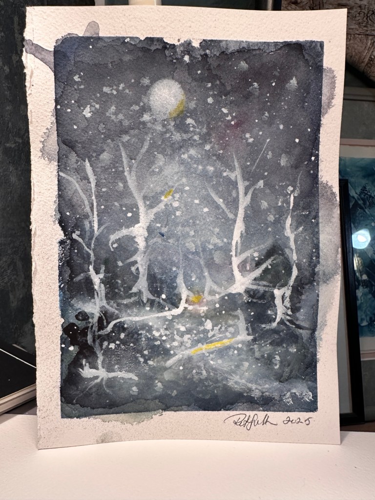 I am improving, at least I like to think so; my skills are evolving. Here are winter landscapes done in my unique style, capturing the serene beauty of snow-covered trees. They reflect my interpretation of winter’s stillness, inviting viewers to immerse themselves in the tranquil scenes and experience the chill in the air through muted colors and textures.
