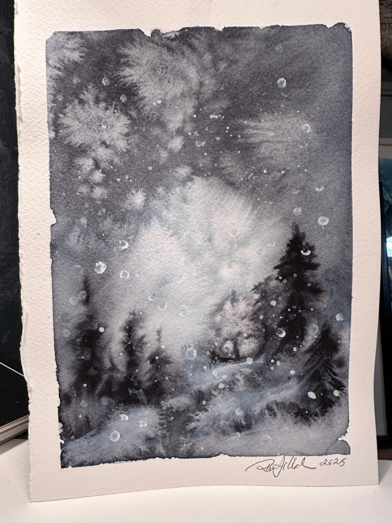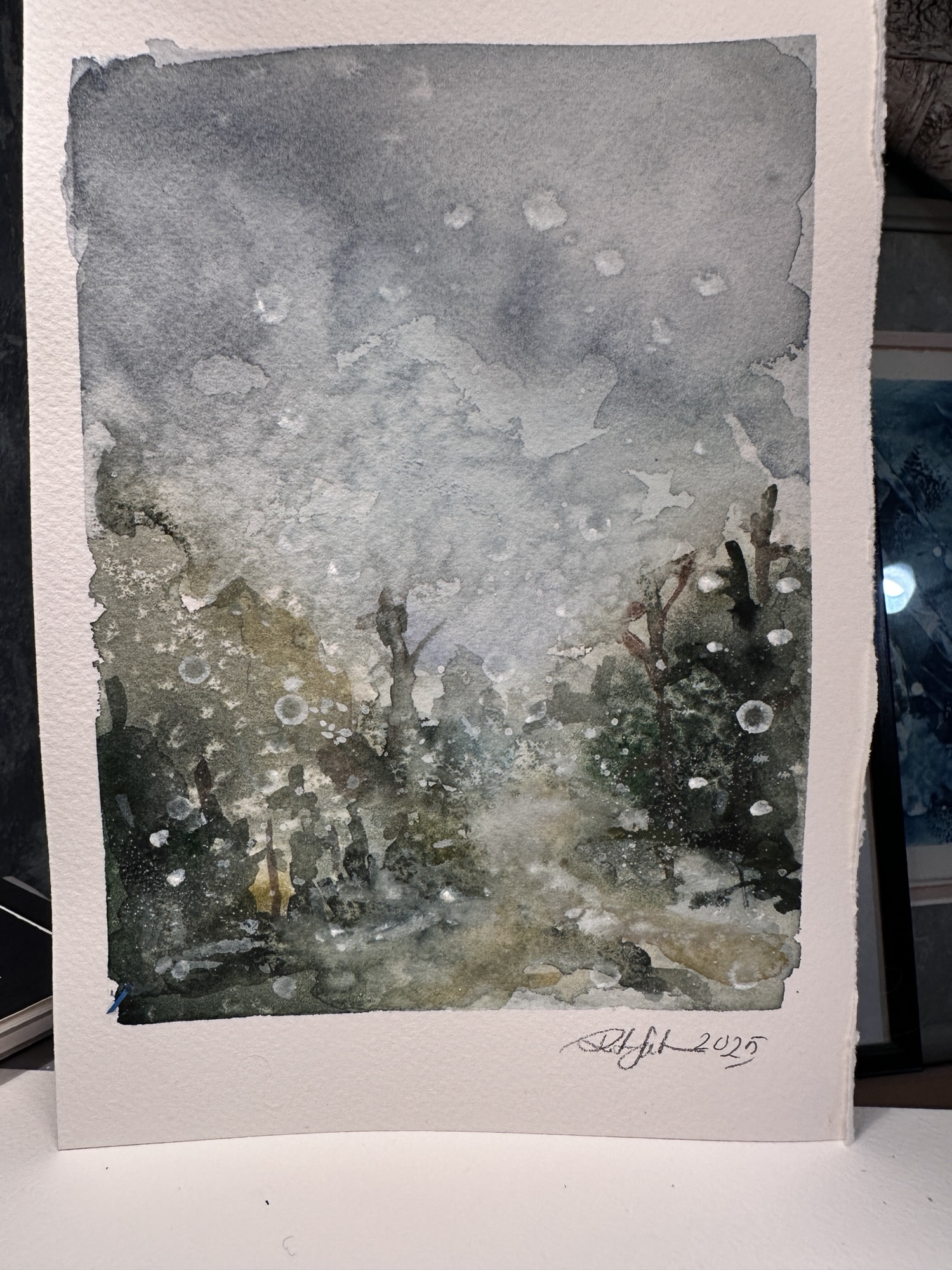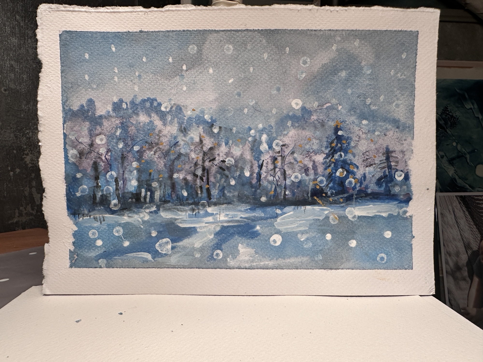 I am improving, at least I like to think so; my skills are evolving. Here are winter landscapes done in my unique style, capturing the serene beauty of snow-covered trees. They reflect my interpretation of winter’s stillness, inviting viewers to immerse themselves in the tranquil scenes and experience the chill in the air through muted colors and textures.