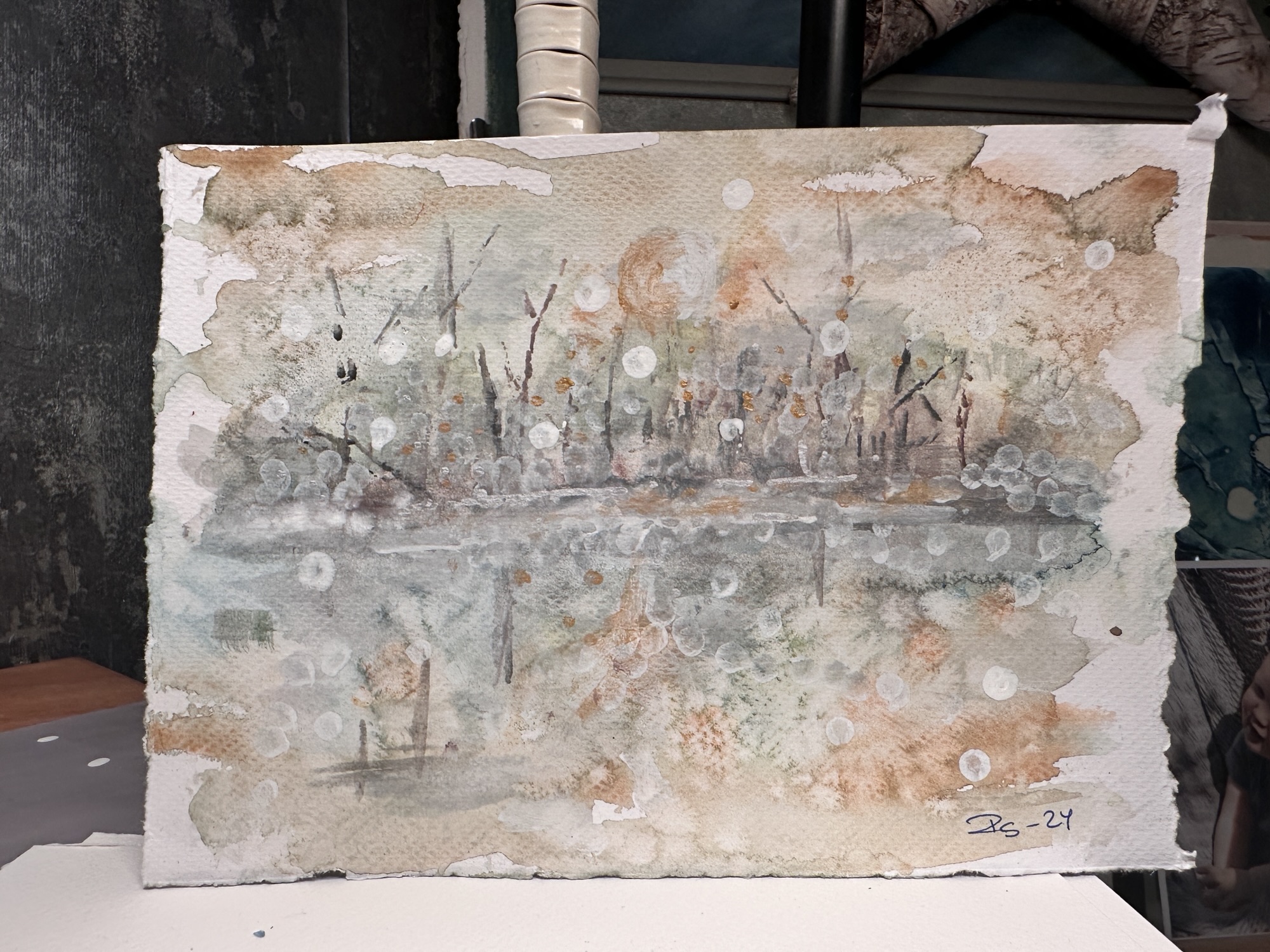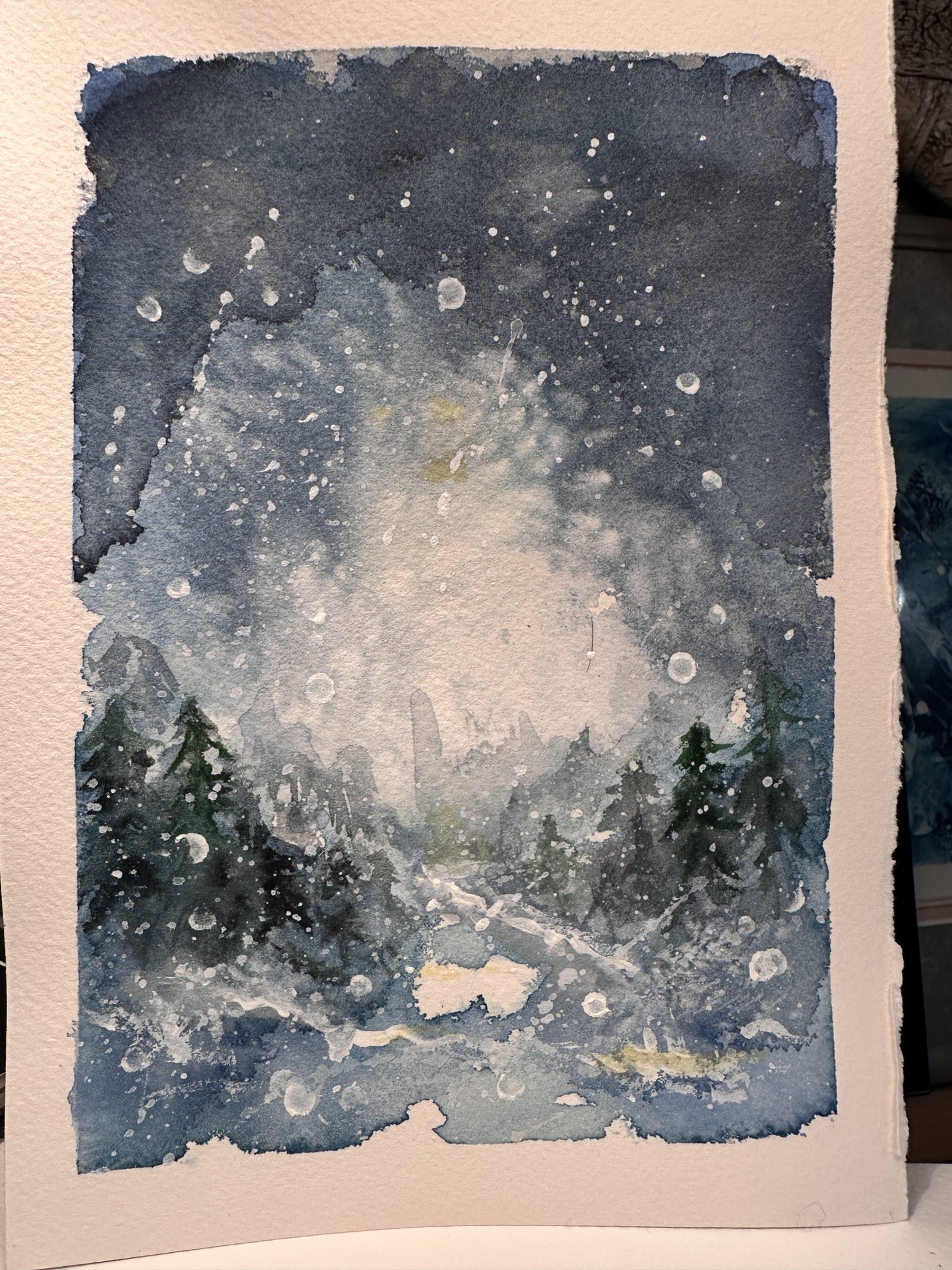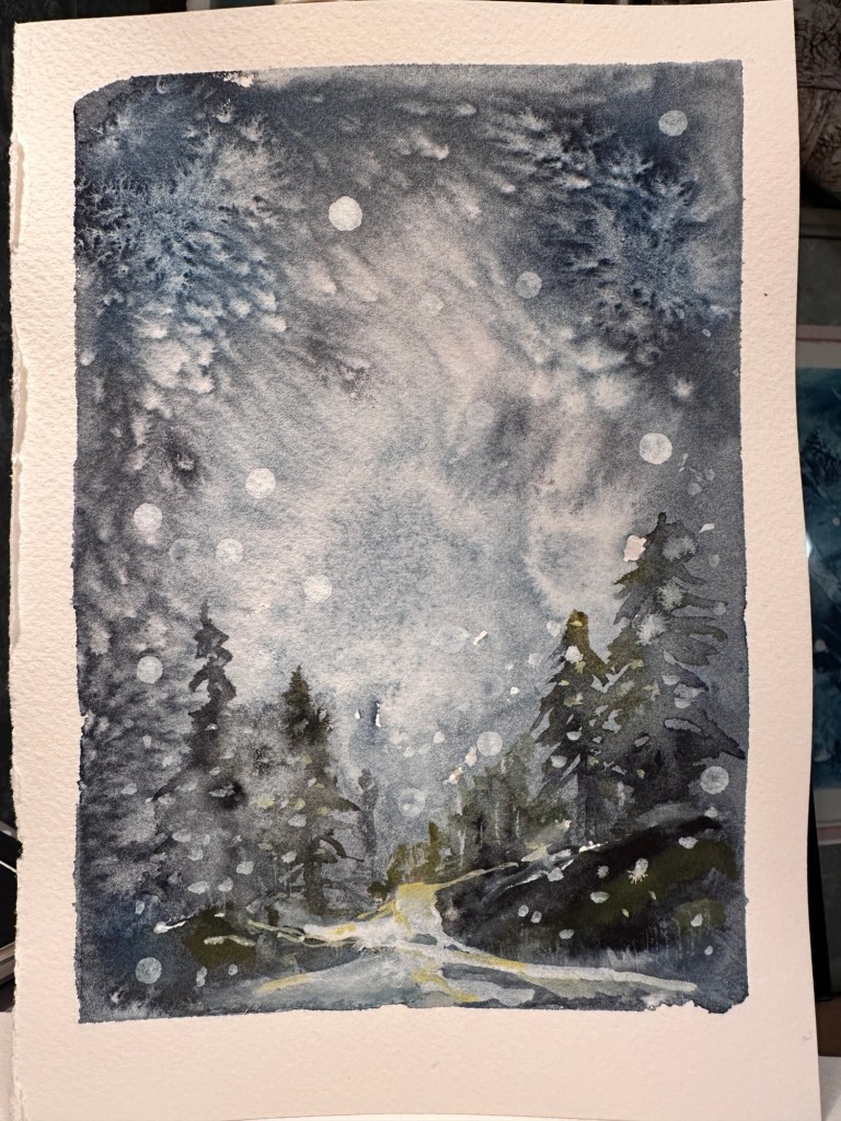 I am improving, at least I like to think so; my skills are evolving. Here are winter landscapes done in my unique style, capturing the serene beauty of snow-covered trees. They reflect my interpretation of winter’s stillness, inviting viewers to immerse themselves in the tranquil scenes and experience the chill in the air through muted colors and textures.