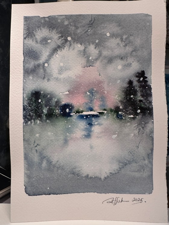I am improving, at least I like to think so; my skills are evolving. Here are winter landscapes done in my unique style, capturing the serene beauty of snow-covered trees. They reflect my interpretation of winter’s stillness, inviting viewers to immerse themselves in the tranquil scenes and experience the chill in the air through muted colors and textures.