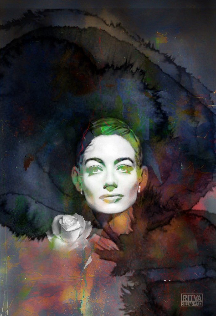 This a mixed media artwork created with a aquarelle painting an old photograph and mixing and the blending of the colors an the other version is lots of flowers creating a flower hat