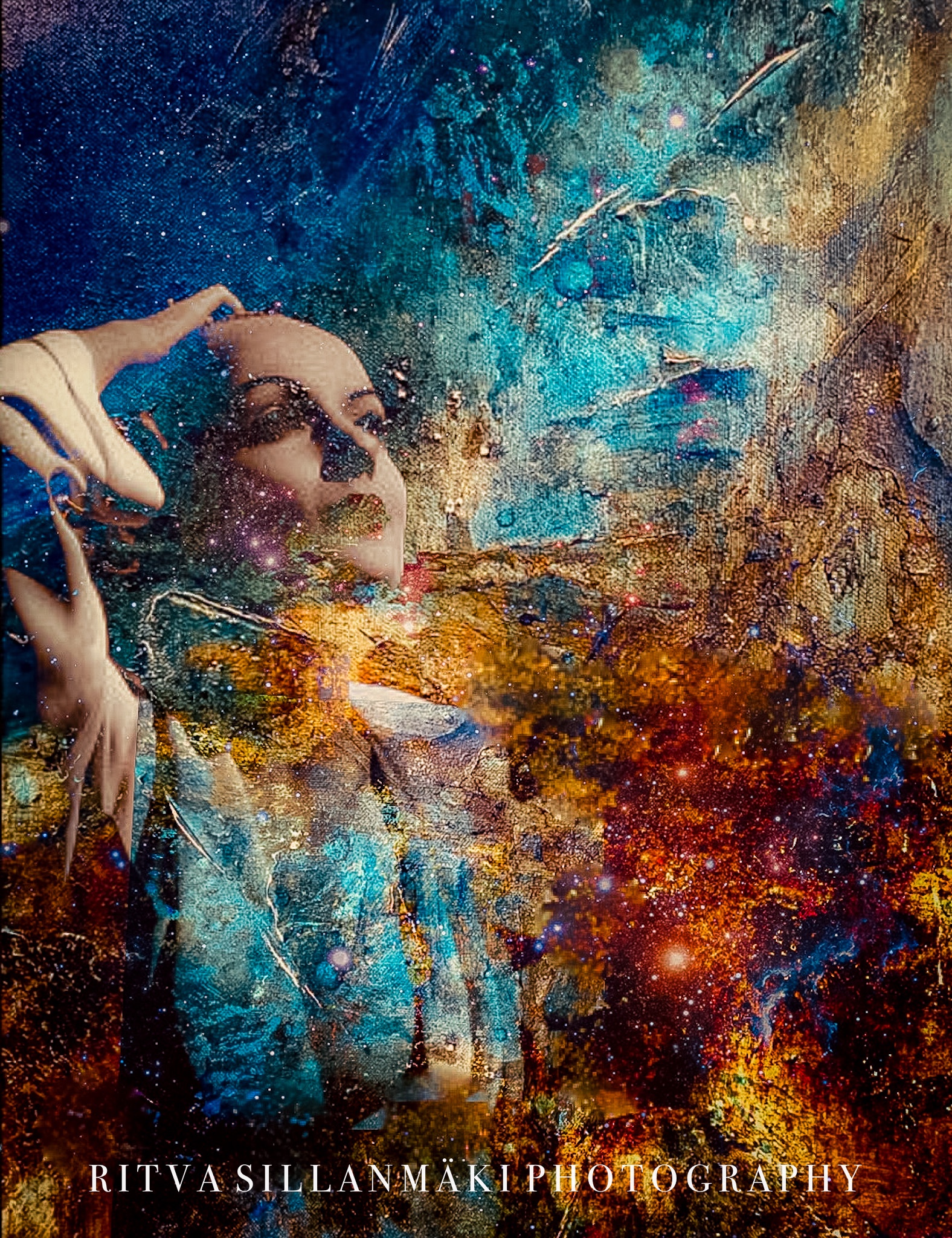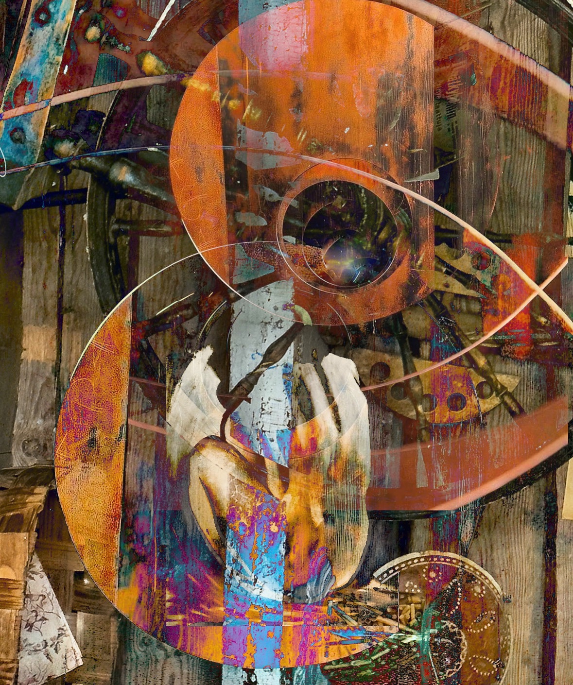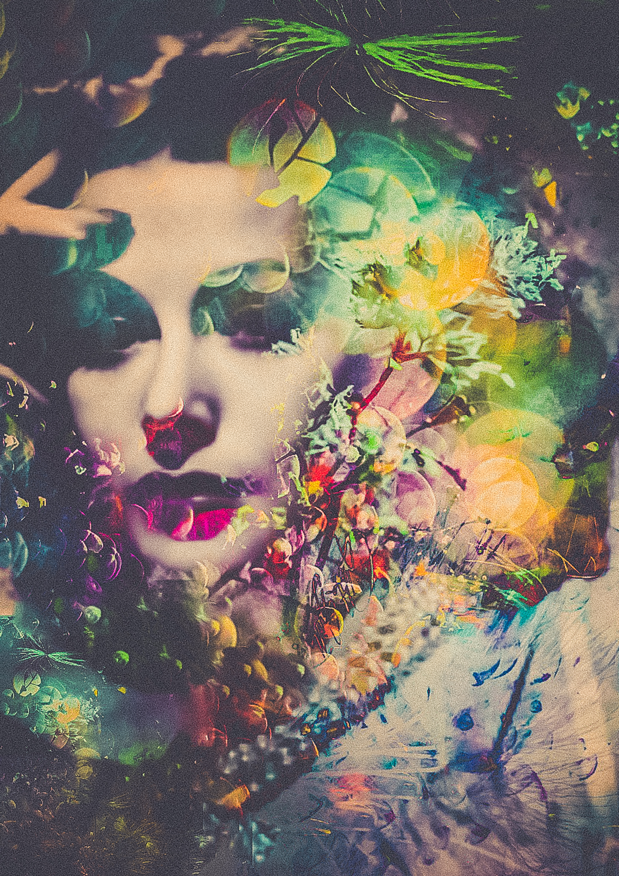 My work is predominantly colorful, imaginative photomontages. It combines photos of nature and people with structural layers made using old photographs, my paintings, and sculptures.