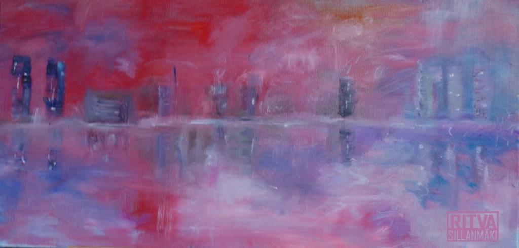 arts, öljymaalaus, beauty, Buildings, City of red light, clouds, colors, heihastus, oil painting, oil painting on canvas, photo collage, photography, photomontage, Punainen kaupunki, red, red light, reflection, taloja, valokuvaus, water