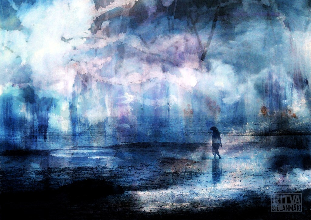 I got carried away with this. I made several variations of this photomontage. It has my painting of city in the background to bring the amount of blues that I wanted it to have, clouds to give it light and seaside to bring my comfort and refuge place into it.